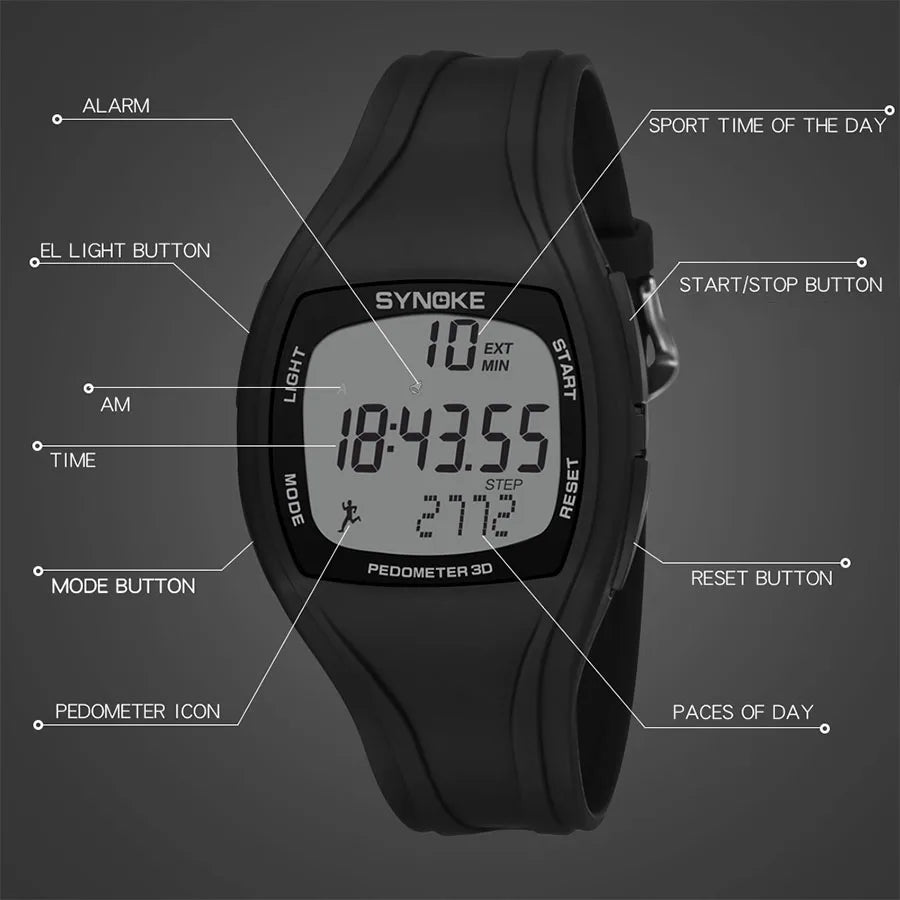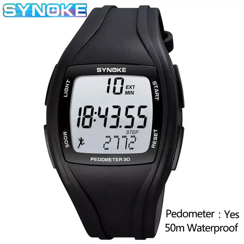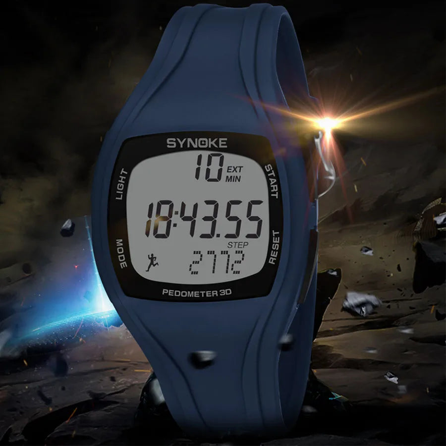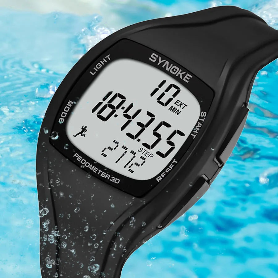 Orologio sportivo digitale con quadrante quadrato da 41 mm e cinturino in PU resistente. Funzioni integrate: contapassi, registrazione tempo allenamento, sveglia, timer e retroilluminazione. Resistente agli urti e all’acqua fino a 5 ATM (50 m).