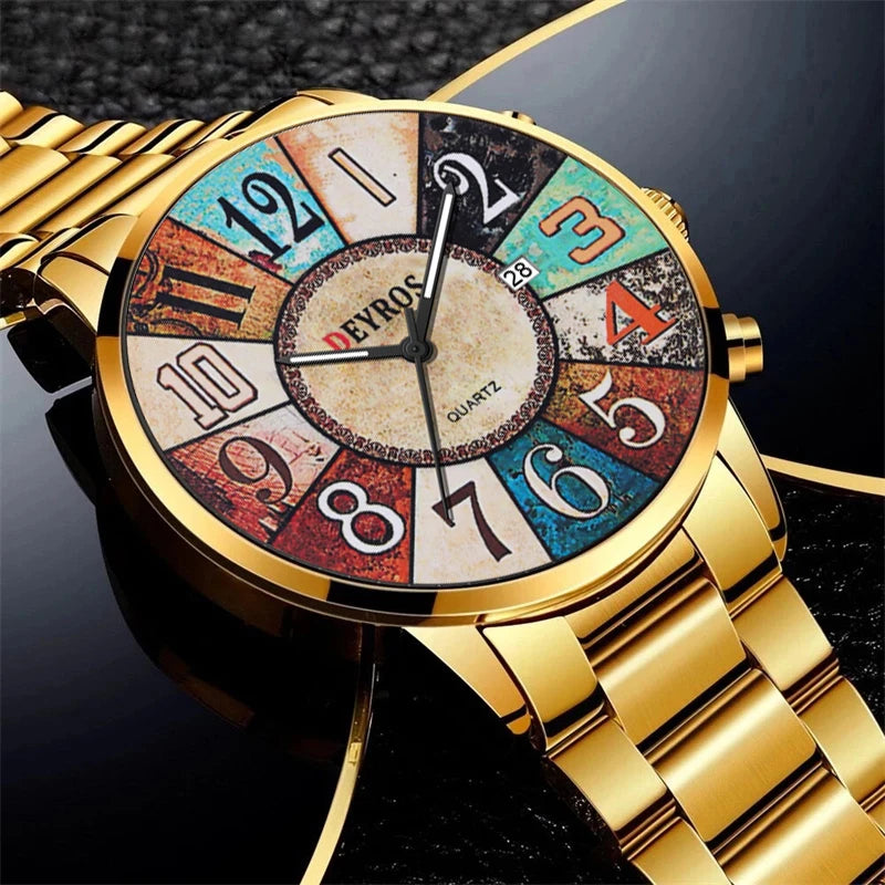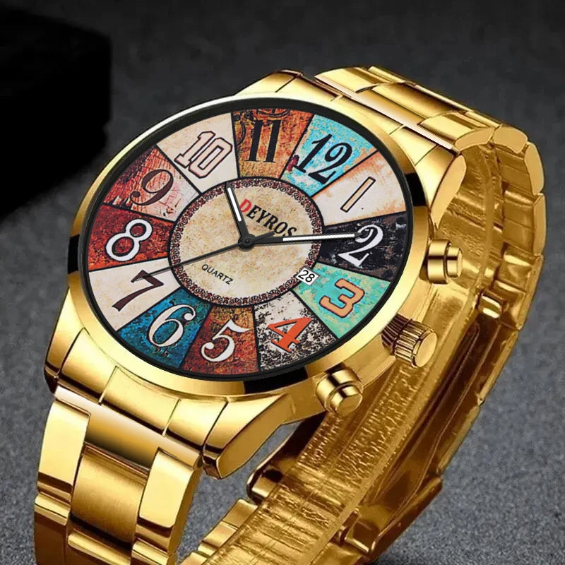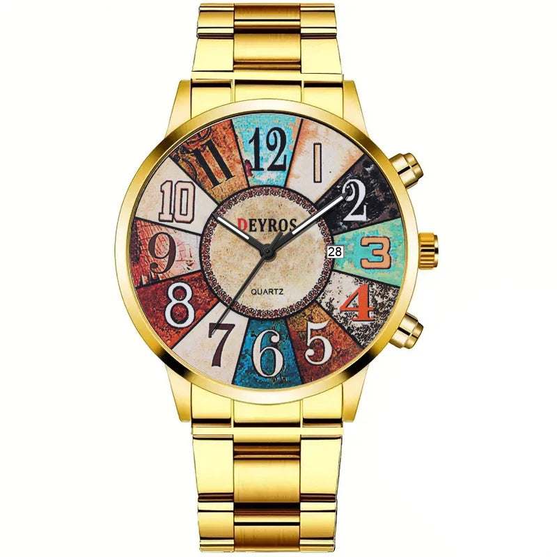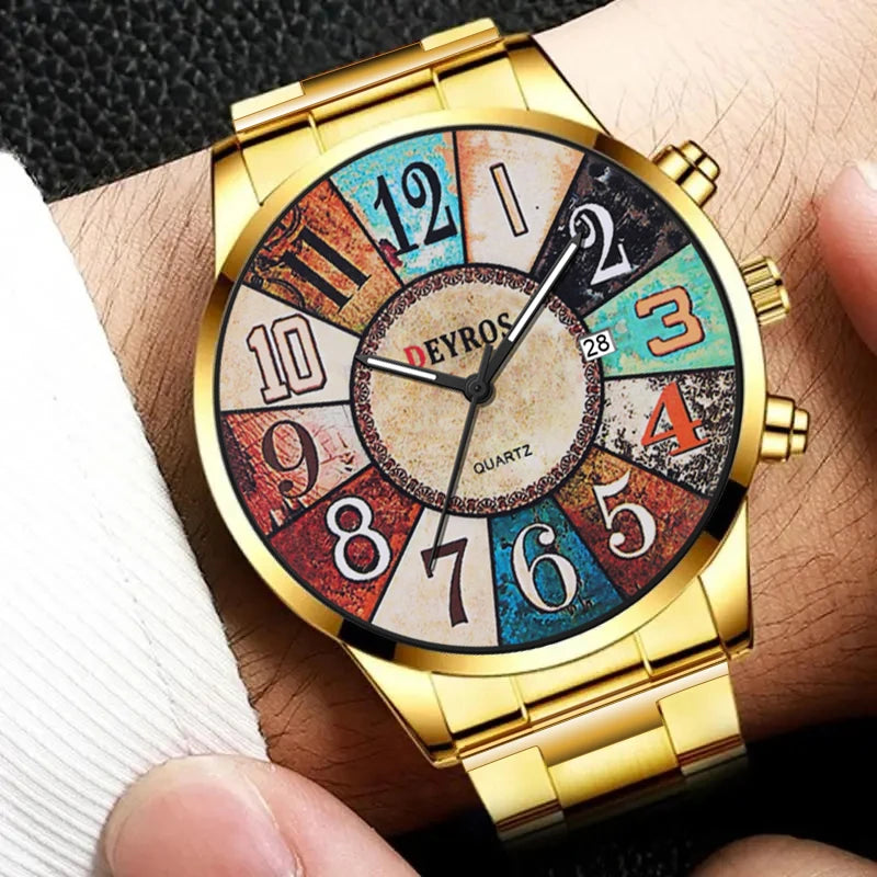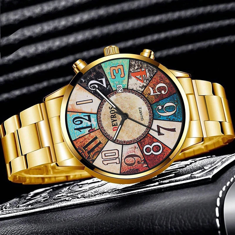 Orologio da uomo al quarzo con quadrante rotondo e cassa in lega dal design elegante. Cinturino in acciaio con chiusura a bracciale, leggero e comodo da indossare. Funzione data, perfetto per look formali o casual.