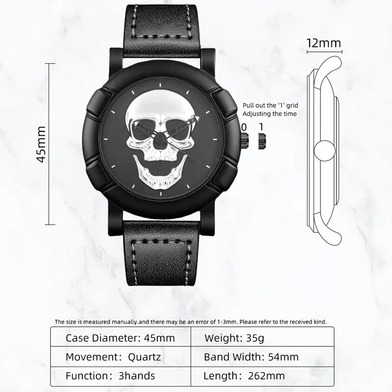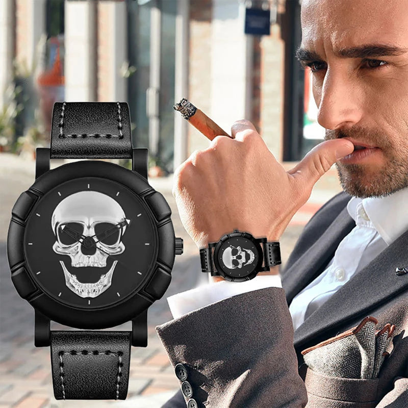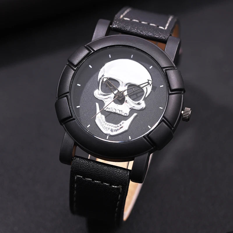 Orologio da uomo dal design originale e grintoso, con quadrante 3D a forma di teschio. Movimento al quarzo preciso, cinturino in similpelle resistente e vetro Hardlex antigraffio. Perfetto per uno stile casual ma d’impatto.