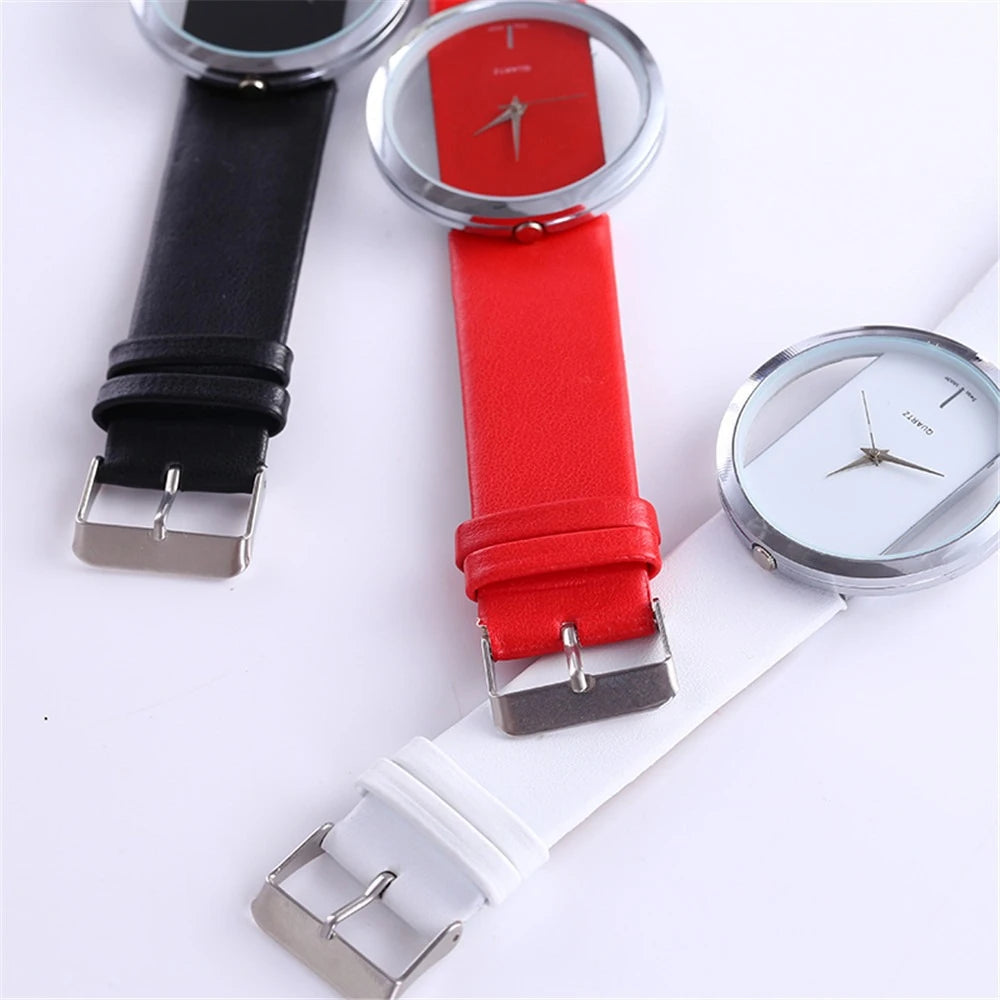 Orologio da donna alla moda con quadrante trasparente e movimento al quarzo preciso. Cassa rotonda in lega dal design sottile, cinturino in similpelle comodo e regolabile con fibbia a gancio. Stile fashion e casual, perfetto per look moderni e raffinati.