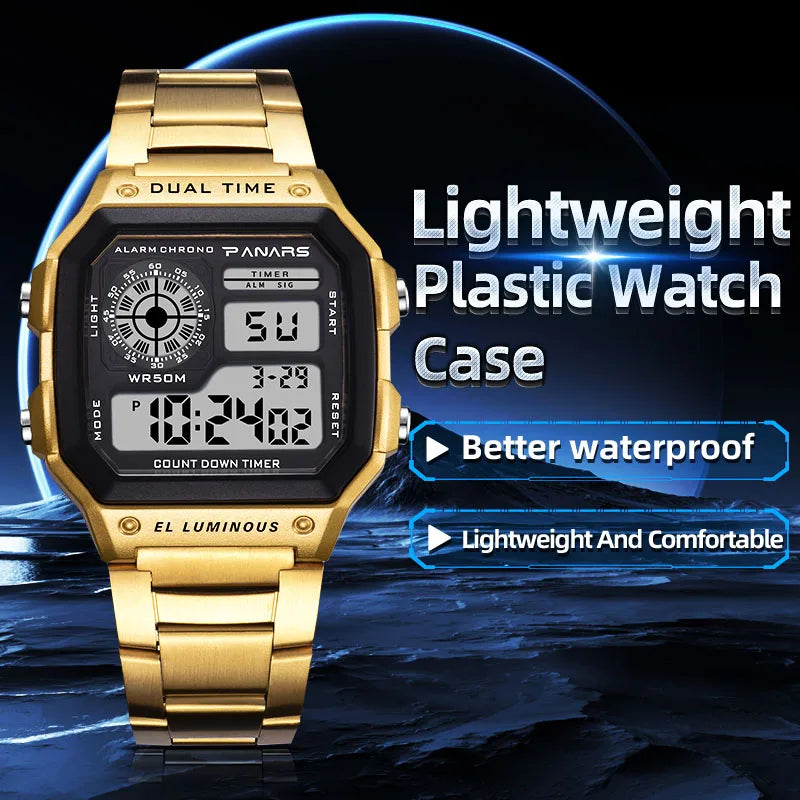 Questo orologio digitale sportivo da uomo, con cassa in acciaio e quadrante LED da 44 mm, unisce robustezza e funzionalità avanzate. Ideale per chi cerca precisione e resistenza, offre una lettura chiara dell’ora anche in condizioni di scarsa illuminazione. La struttura in acciaio garantisce durata nel tempo, mentre il design moderno si adatta perfettamente a uno stile dinamico e sportivo.