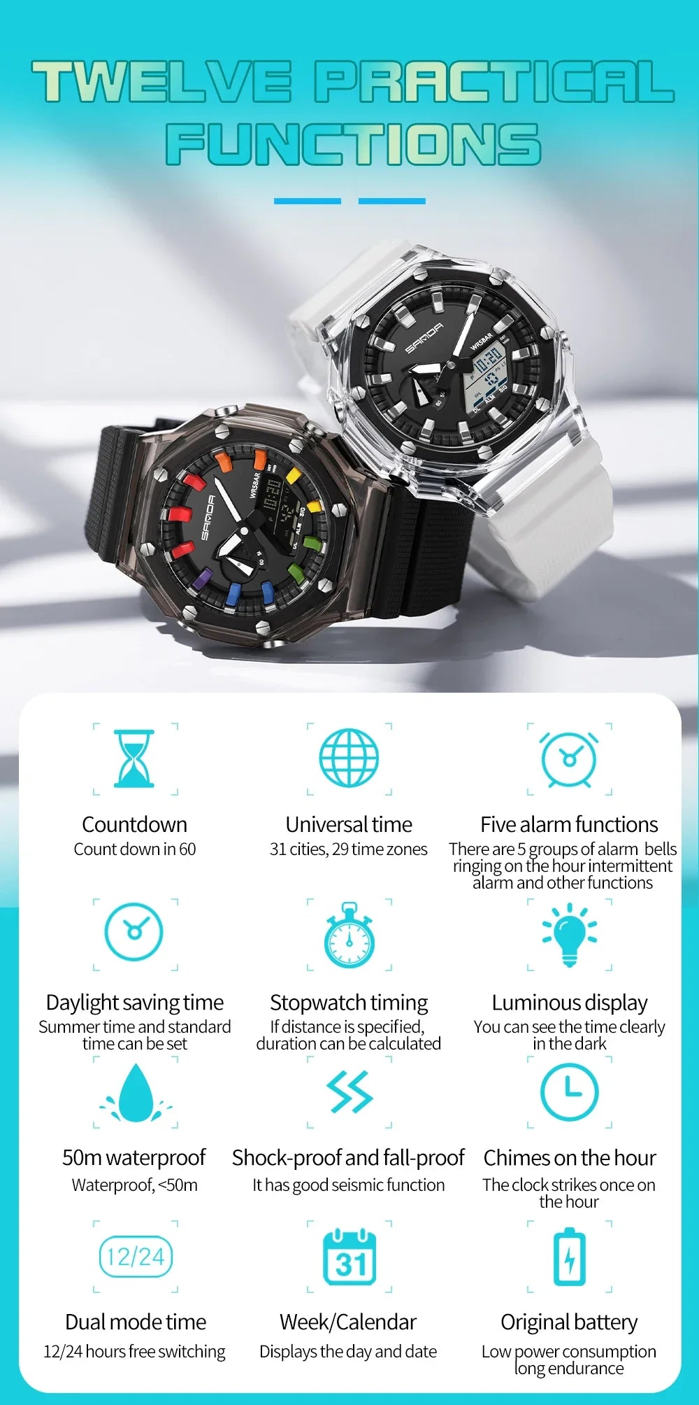 Caratteristiche : cronometro, resistente agli urti, display LED, luminoso, data automatica, cronografo, calendario completo, resistenza all'acqua, sveglia