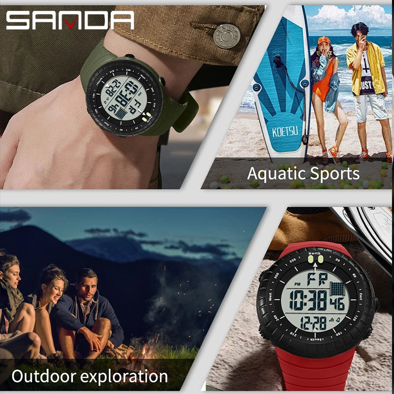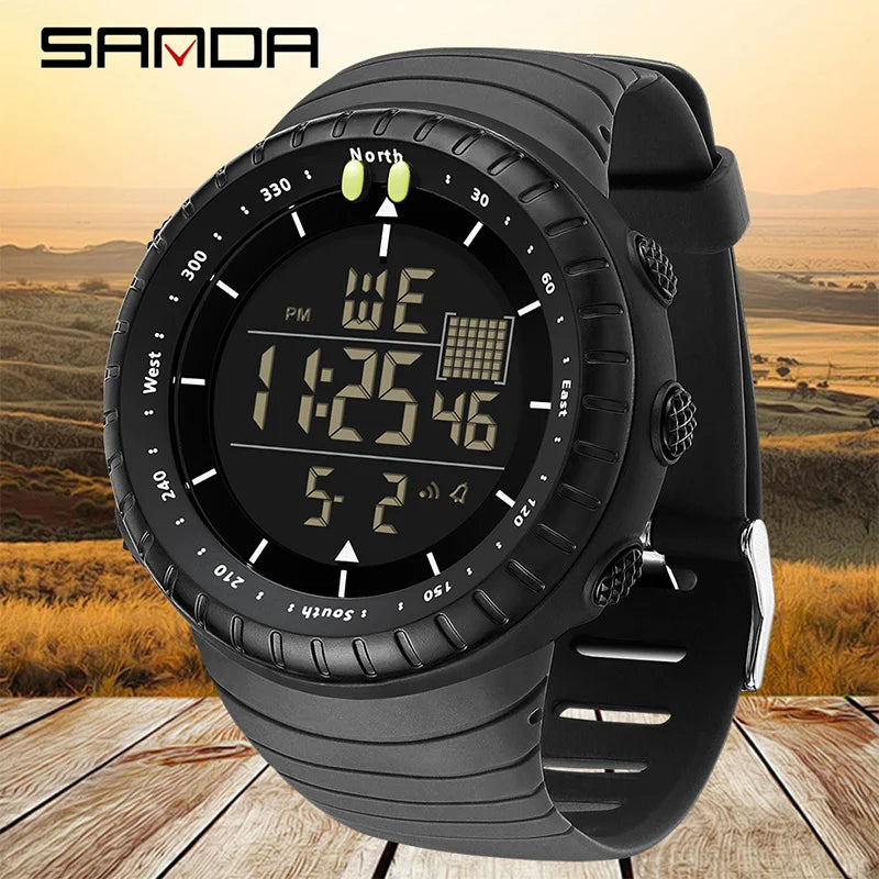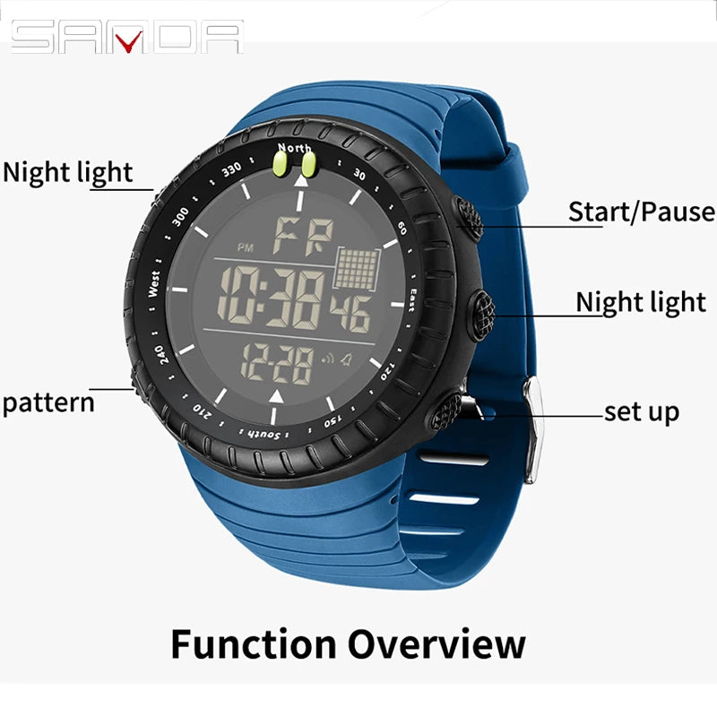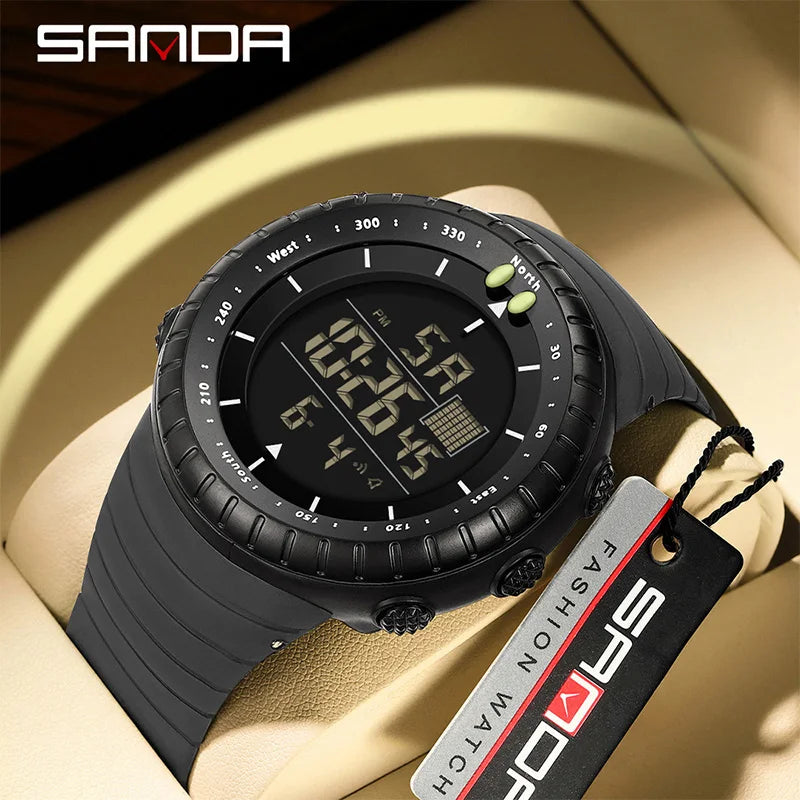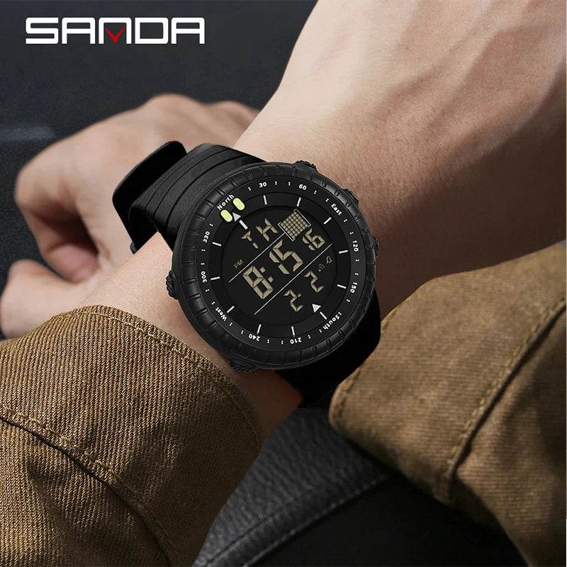 Orologio elettronico da uomo in stile sportivo, con quadrante oversize e funzioni complete. Il display digitale a LED garantisce una lettura chiara anche al buio grazie alla retroilluminazione. Dotato di cronografo, sveglia e calendario settimanale, è progettato per accompagnarti in ogni attività quotidiana e sportiva.